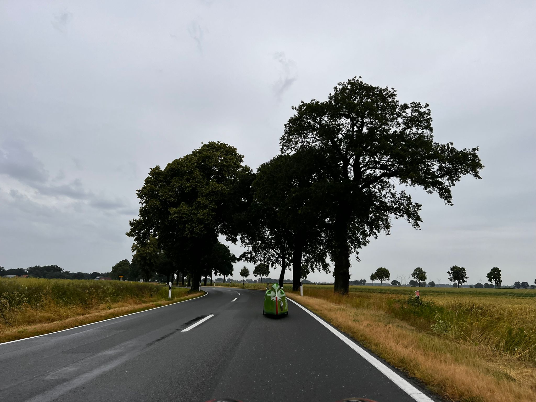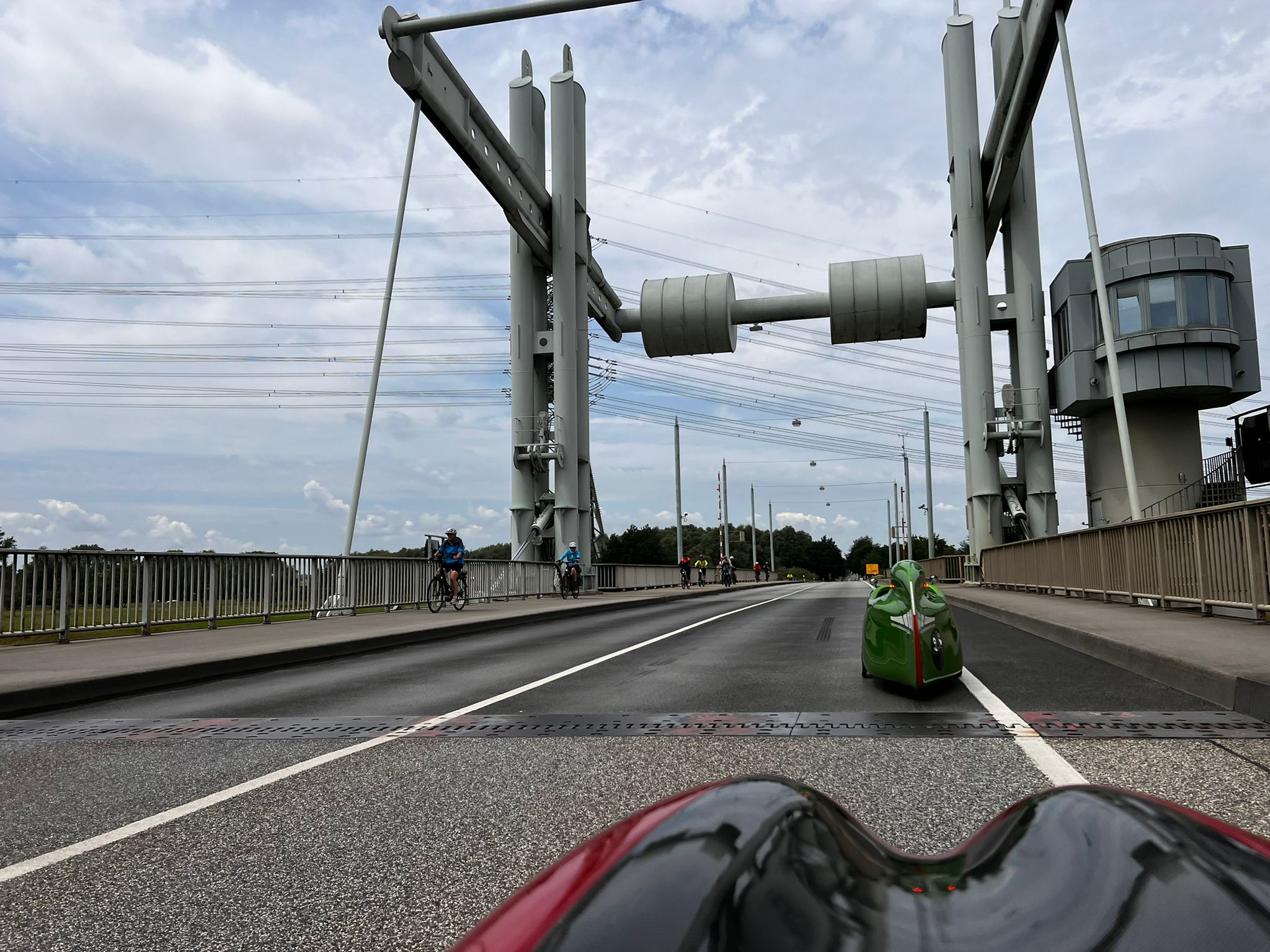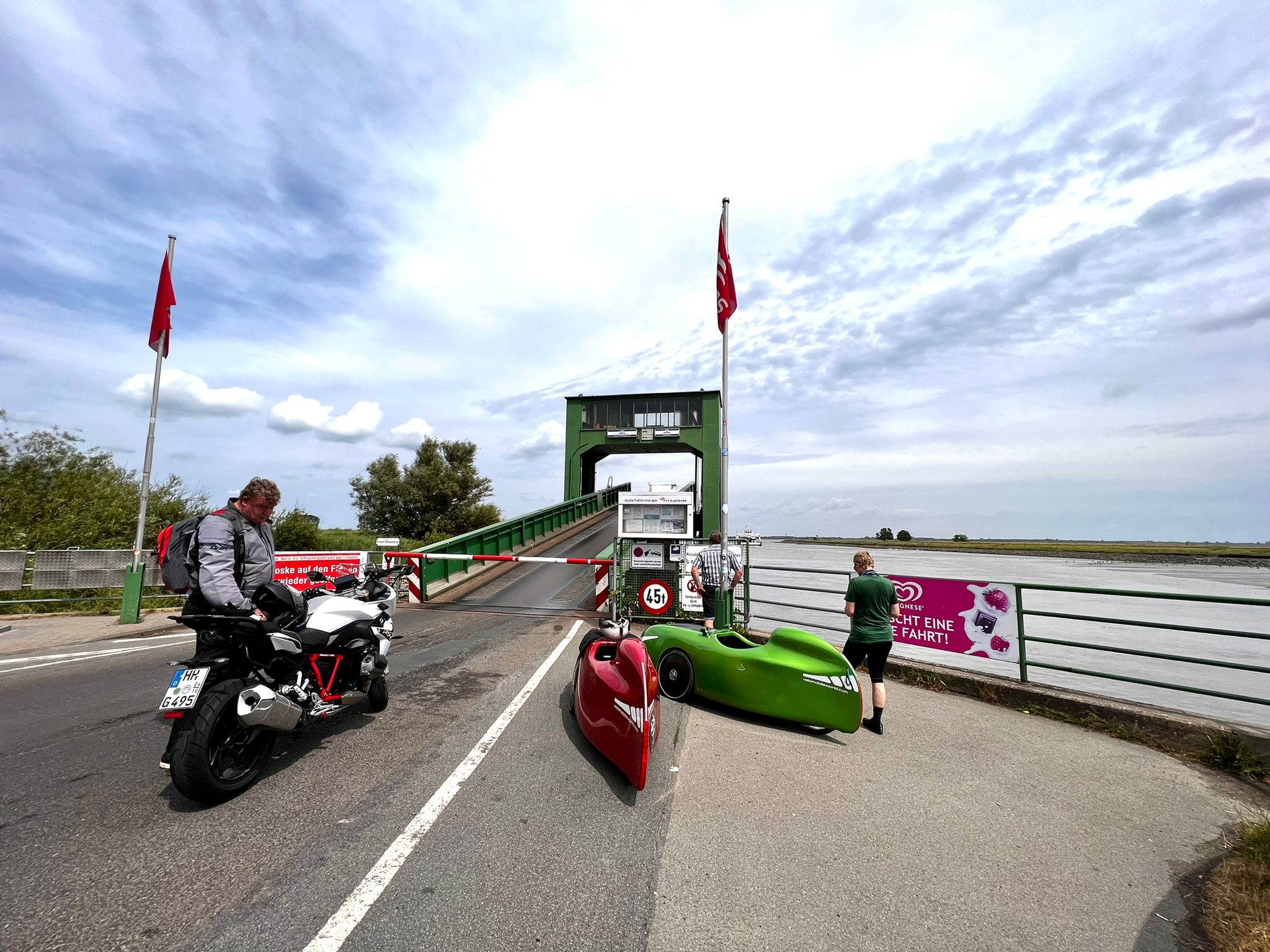 Aujourd'hui, nous avons dormi plus longtemps, jusqu'à 6 h 09, ce qui était encore tôt. Nous avons pris un petit déjeuner tranquille, nous avons fait nos bagages et nous sommes partis à 7 h 30 sous une pluie fine. La pluie s'est rapidement intensifiée, comme l'annonçaient les prévisions météorologiques. Nous avons donc mis la housse en mousse et avons continué à rouler. À 9 h 30, nous avons rejoint Benno. Il nous avait invités la veille à prendre un café et un gâteau. On peut aussi prendre un café et un gâteau à 9h30 du matin. La demi-heure prévue s'est vite transformée en une heure entière. Puis nous sommes finalement repartis, comme prévu sous une pluie battante. Nous avons traversé la campagne nord-allemande en direction de Stade. Nous nous sommes arrêtés chez Sven Kröll, l'un des meilleurs vendeurs de vélomobiles. Mais il n'y avait personne à la maison. A Kutenholz, nous avons cherché un café et nous avons de nouveau pris un café et un gâteau. C'était notre déjeuner. Il ne nous restait plus qu'à nous rendre à Wischhafen pour prendre le ferry de l'Elbe à destination de Glückstadt. Nous n'avions pas vraiment regardé la distance à parcourir et nous avons été surpris de constater qu'elle était assez longue. La circulation autour de Stade était très dense et gênante, ce qui était probablement dû au fait que c'était le vendredi après-midi. Beaucoup d'automobilistes, d'autre part, trouvaient les deux vélomobiles devant eux très ennuyeux, parce qu'ils restaient toujours coincés dans les embouteillages.