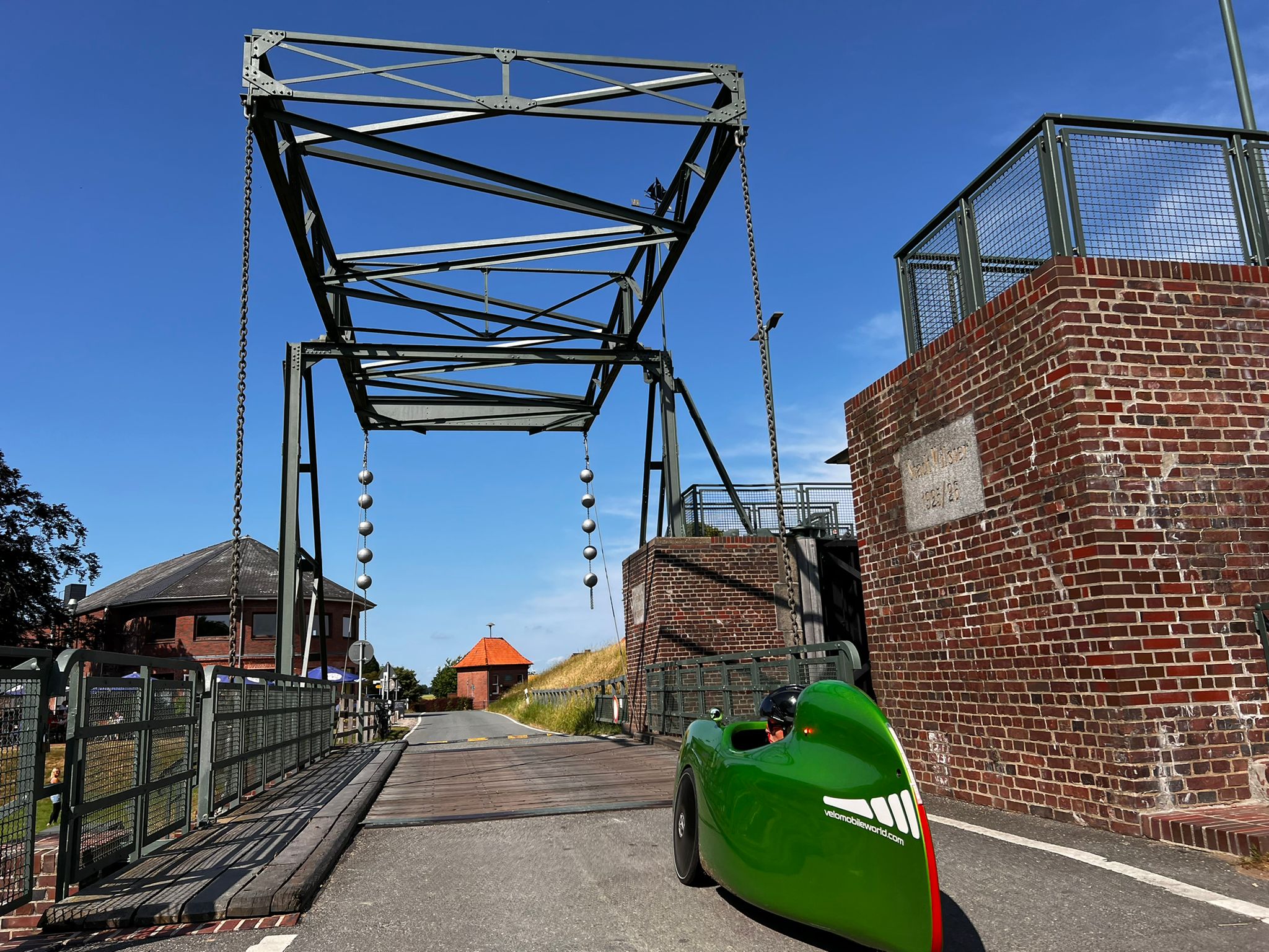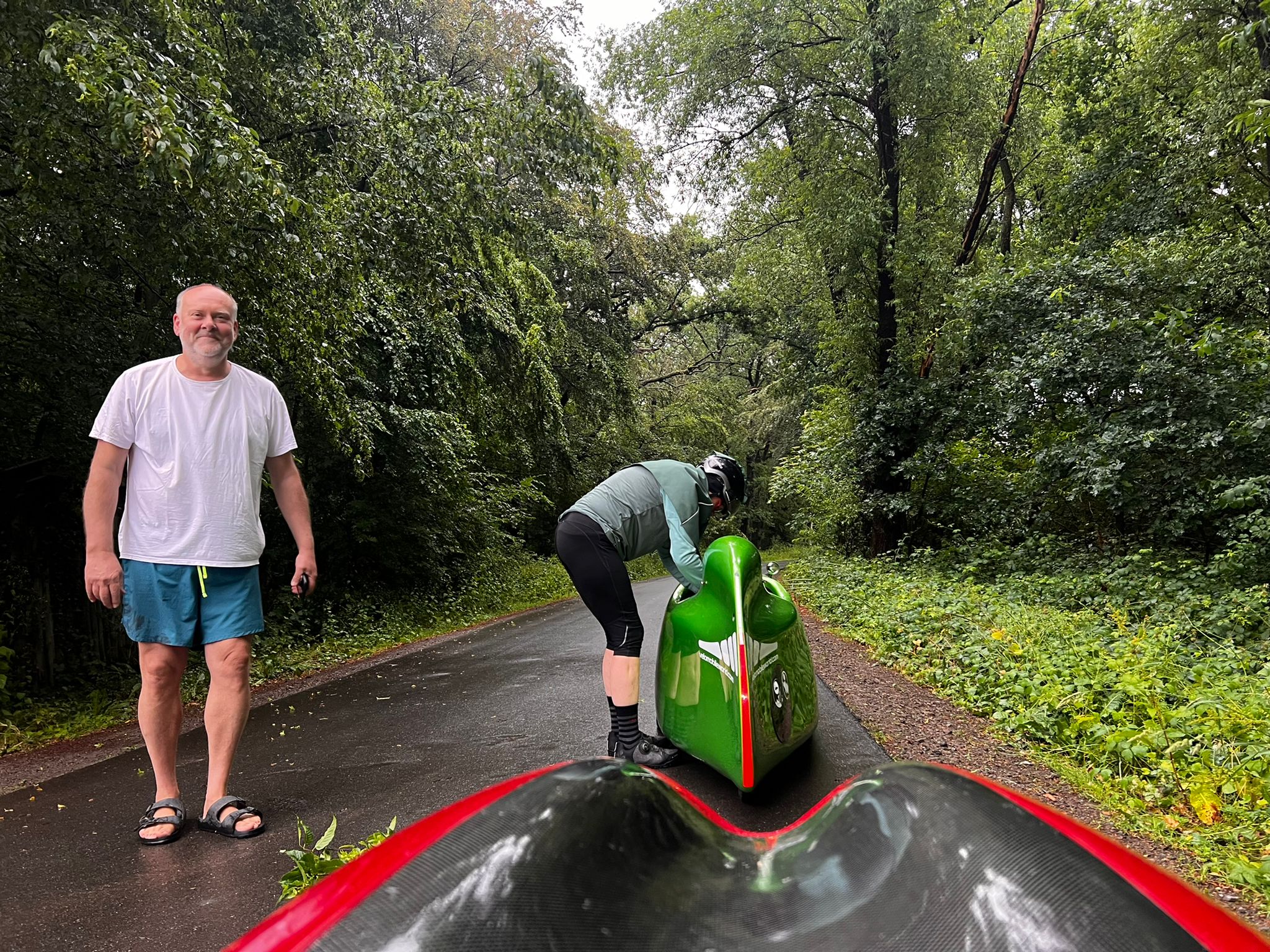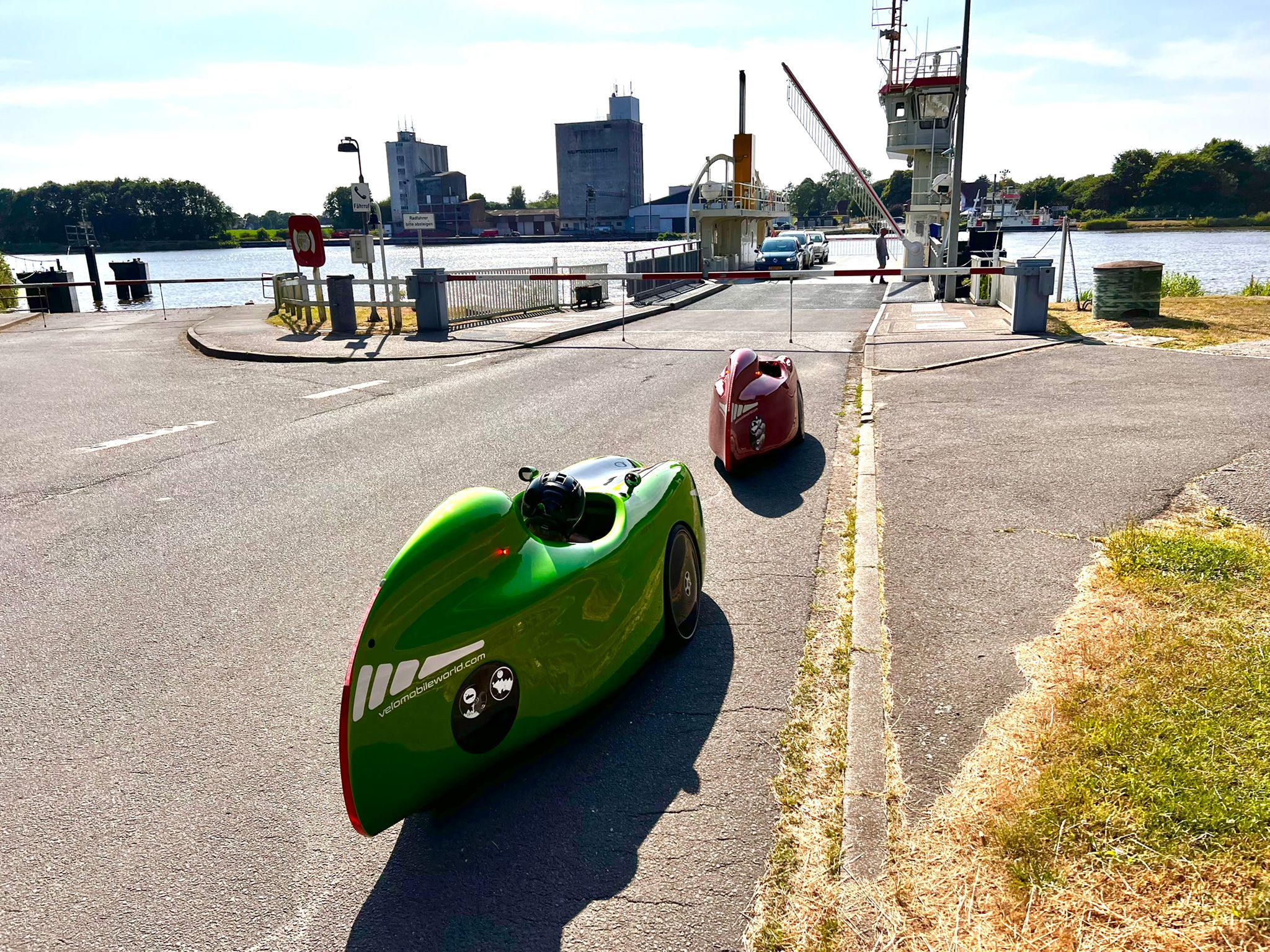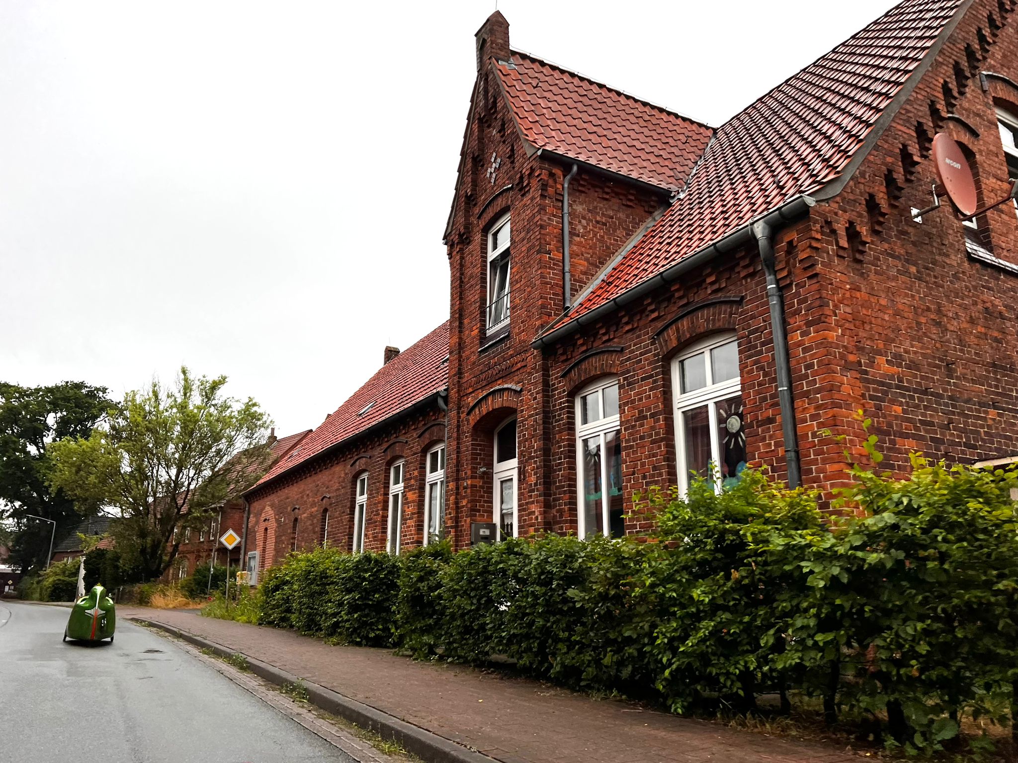 Aujourd'hui, nous avons dormi plus longtemps, jusqu'à 6 h 09, ce qui était encore tôt. Nous avons pris un petit déjeuner tranquille, nous avons fait nos bagages et nous sommes partis à 7 h 30 sous une pluie fine. La pluie s'est rapidement intensifiée, comme l'annonçaient les prévisions météorologiques. Nous avons donc mis la housse en mousse et avons continué à rouler. À 9 h 30, nous avons rejoint Benno. Il nous avait invités la veille à prendre un café et un gâteau. On peut aussi prendre un café et un gâteau à 9h30 du matin. La demi-heure prévue s'est vite transformée en une heure entière. Puis nous sommes finalement repartis, comme prévu sous une pluie battante. Nous avons traversé la campagne nord-allemande en direction de Stade. Nous nous sommes arrêtés chez Sven Kröll, l'un des meilleurs vendeurs de vélomobiles. Mais il n'y avait personne à la maison. A Kutenholz, nous avons cherché un café et nous avons de nouveau pris un café et un gâteau. C'était notre déjeuner. Il ne nous restait plus qu'à nous rendre à Wischhafen pour prendre le ferry de l'Elbe à destination de Glückstadt. Nous n'avions pas vraiment regardé la distance à parcourir et nous avons été surpris de constater qu'elle était assez longue. La circulation autour de Stade était très dense et gênante, ce qui était probablement dû au fait que c'était le vendredi après-midi. Beaucoup d'automobilistes, d'autre part, trouvaient les deux vélomobiles devant eux très ennuyeux, parce qu'ils restaient toujours coincés dans les embouteillages.