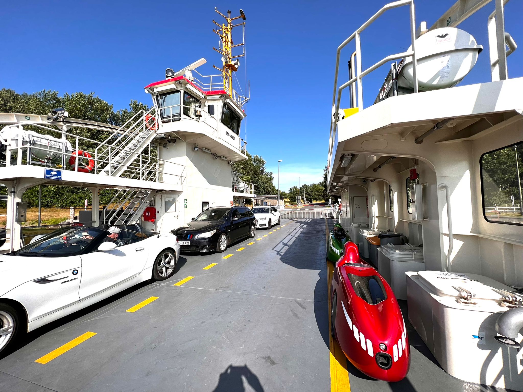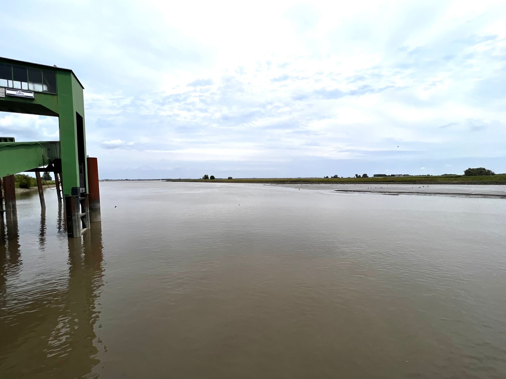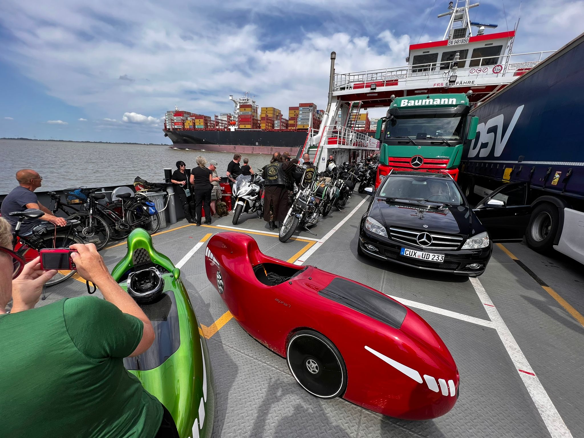 Vers trois heures, nous sommes arrivés à Wischhafen. La pluie s'est arrêtée et le temps s'éclaircit. Le ferry est parti sous notre nez. Au bout d'un quart d'heure, le suivant est arrivé et nous a emmenés de l'autre côté. Avec un groupe de rockeurs amateurs, les Highway Lions, venus de Bochum sur leurs motos.