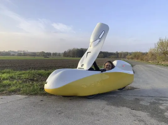 A person with curly hair smiling from inside a white and yellow velomobile with the top canopy open. The vehicle is on a paved road beside agricultural fields with forests in the background under a clear sky.